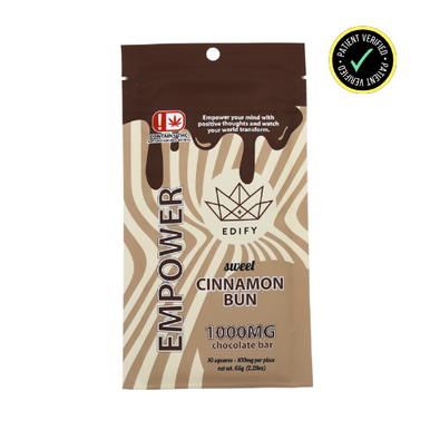 Have fun being EXTRA with this 1000mg THC Extra Strength version of our original Edify Cinnamon Roll Chocolate Bar! Enjoy Edify premium medical grade white chocolate crafted with the finest ingredients for a highly delicious experience. Each square contains 100mg of premium medical grade full spectrum distillate, milk chocolate, and cinnamon sugar for a total of 1000mg in each bar.